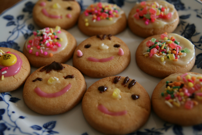ピンクと白のチョコが少しあまったので 爪楊枝でビスケットに顔を描いて遊んでみました。